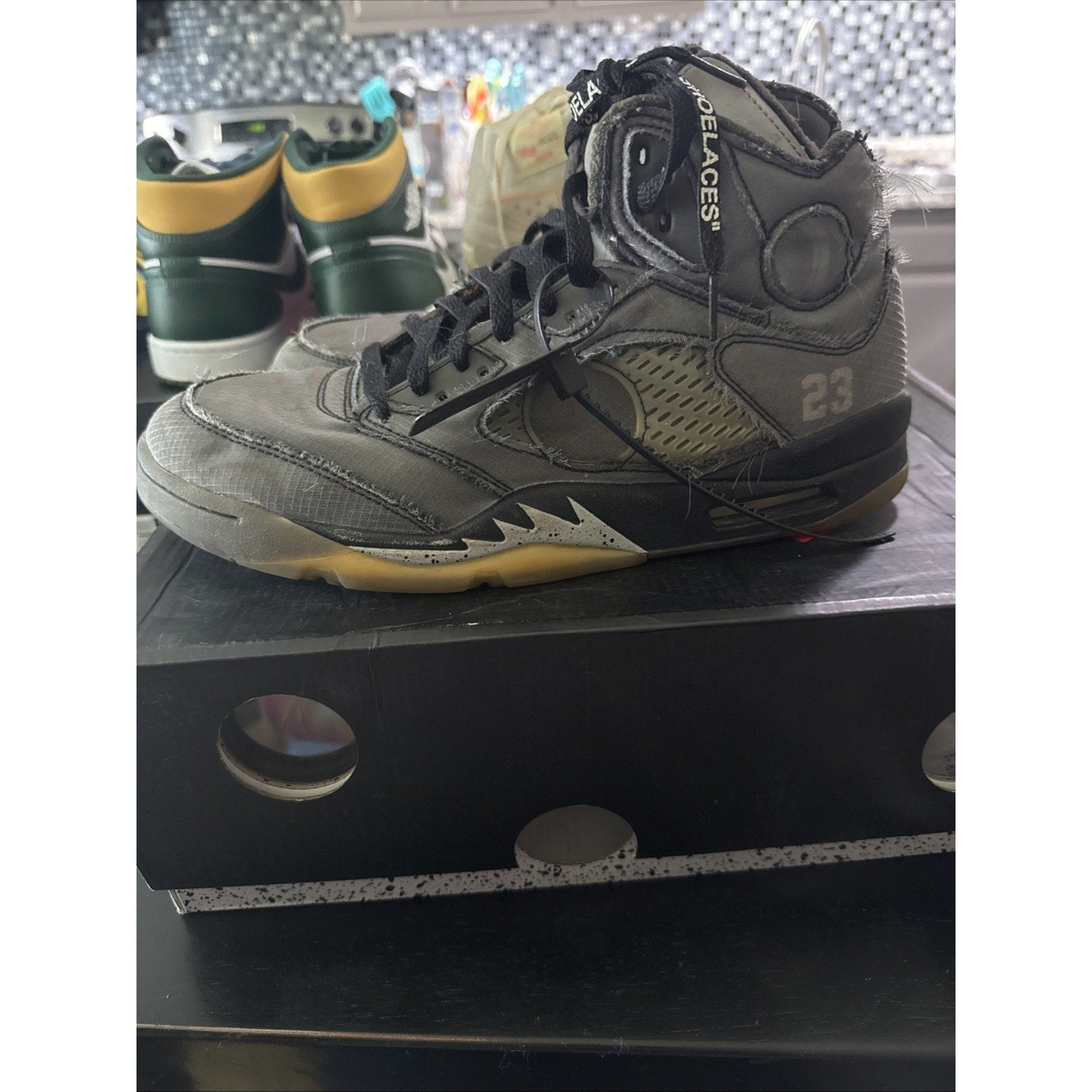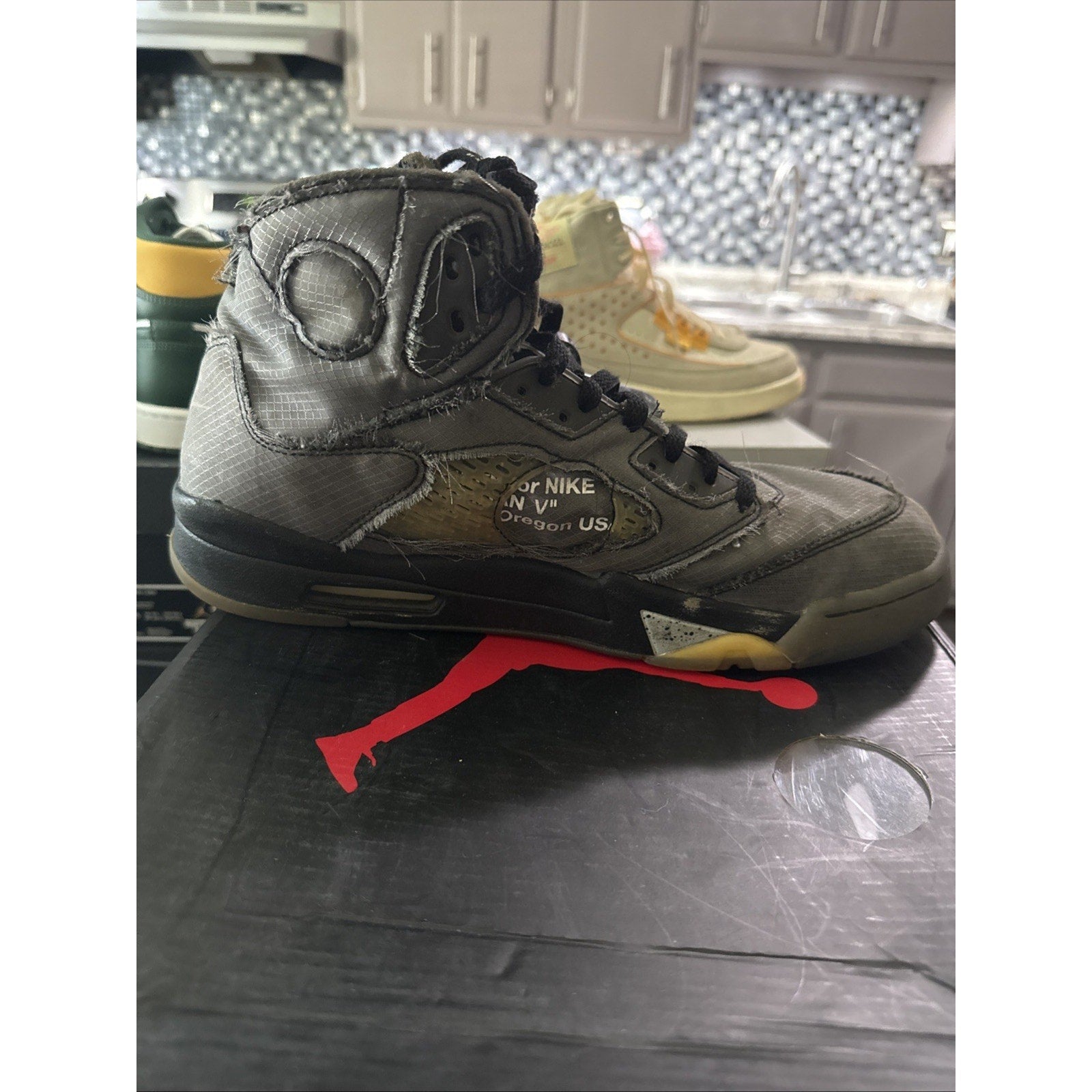 The Size 12 Jordan 5 Retro SP x Off-White Mid Muslin is a limited edition sneaker collaboration between Jordan and Off-White. This mid-top athletic shoe features a black colorway with unique detailing from the Off-White brand. From the Air Jordan 5 silhouette to the Jordan 5 SP x Off-White Ivory silhouette, this sneakers offer a stylish and collectible option for men looking to add to their shoe collection.