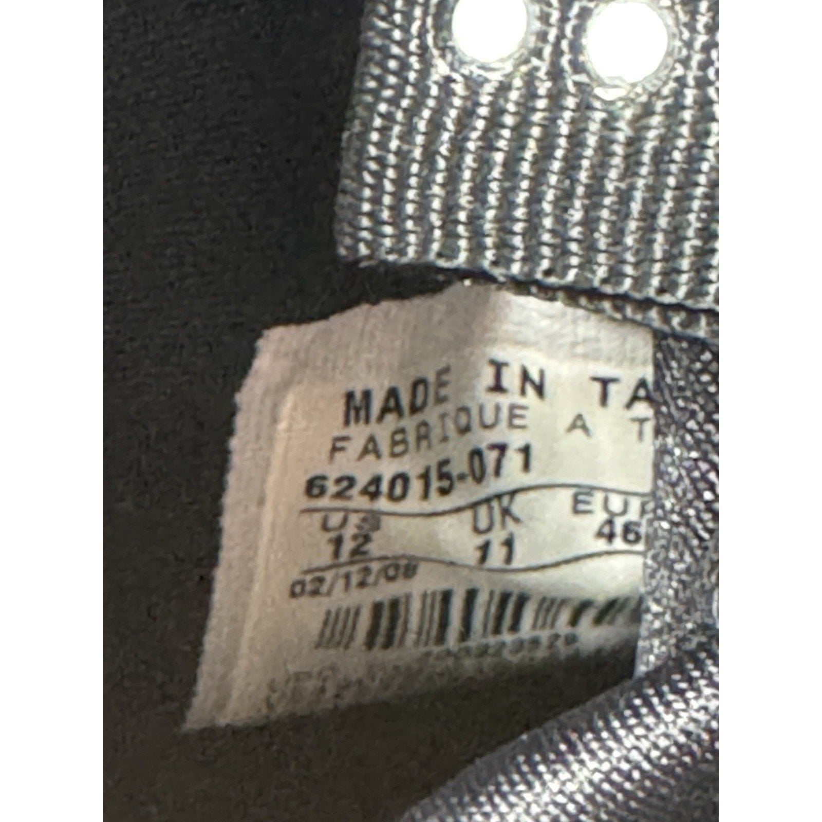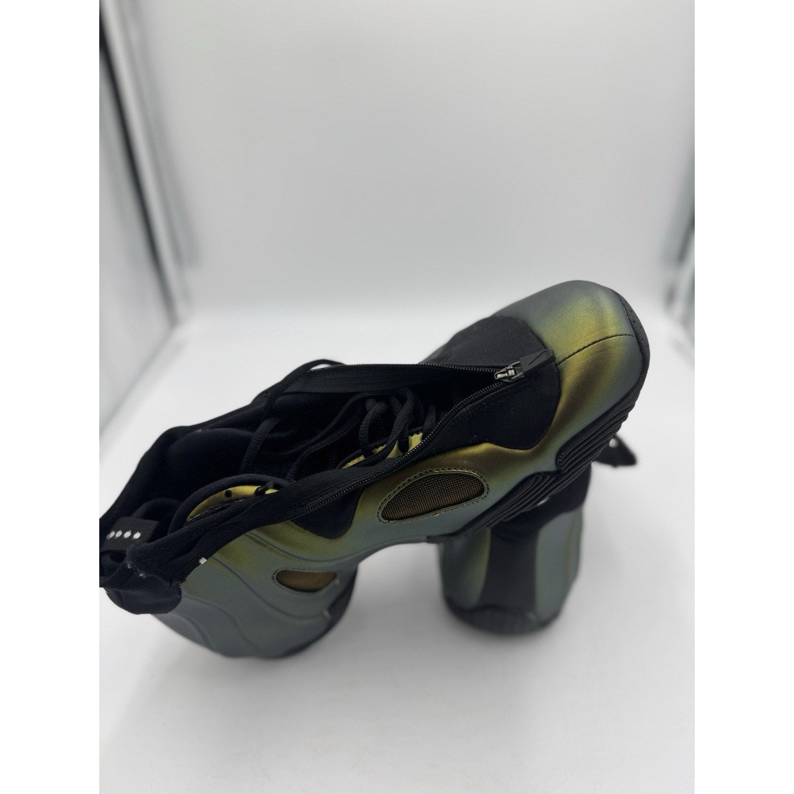 The product is a men's size 12 Nike Air Flightposite sneaker from the 2008 release in metallic gold color. This athletic shoe features the iconic Nike Air Flightposite design with a sleek sneaker style. With a black colorway and a stylish metallic gold accent, this shoe is sure to make a statement both on and off the court. Perfect for sports enthusiasts or collectors looking for a unique and limited edition pair of sneakers.