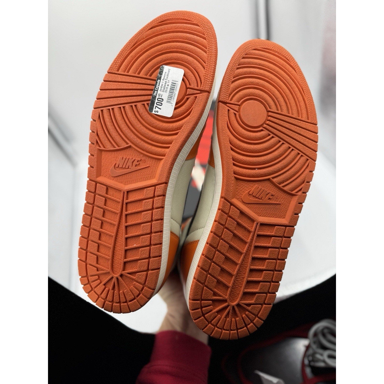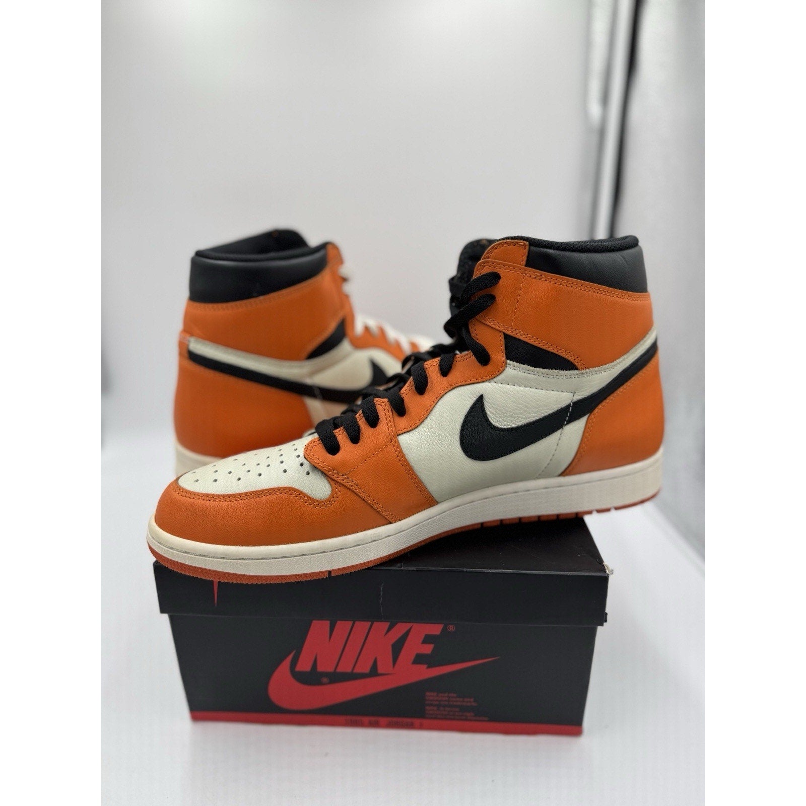 The product is a Size 14 Jordan 1 Retro High OG sneaker from 2016. It features a high top design with a shattered backboard away aesthetic, making it a unique and eye-catching option for men who wear athletic shoes. The orange color scheme adds a vibrant and bold touch to the Air Jordan 1 silhouette, making it a standout choice for sneaker enthusiasts.
