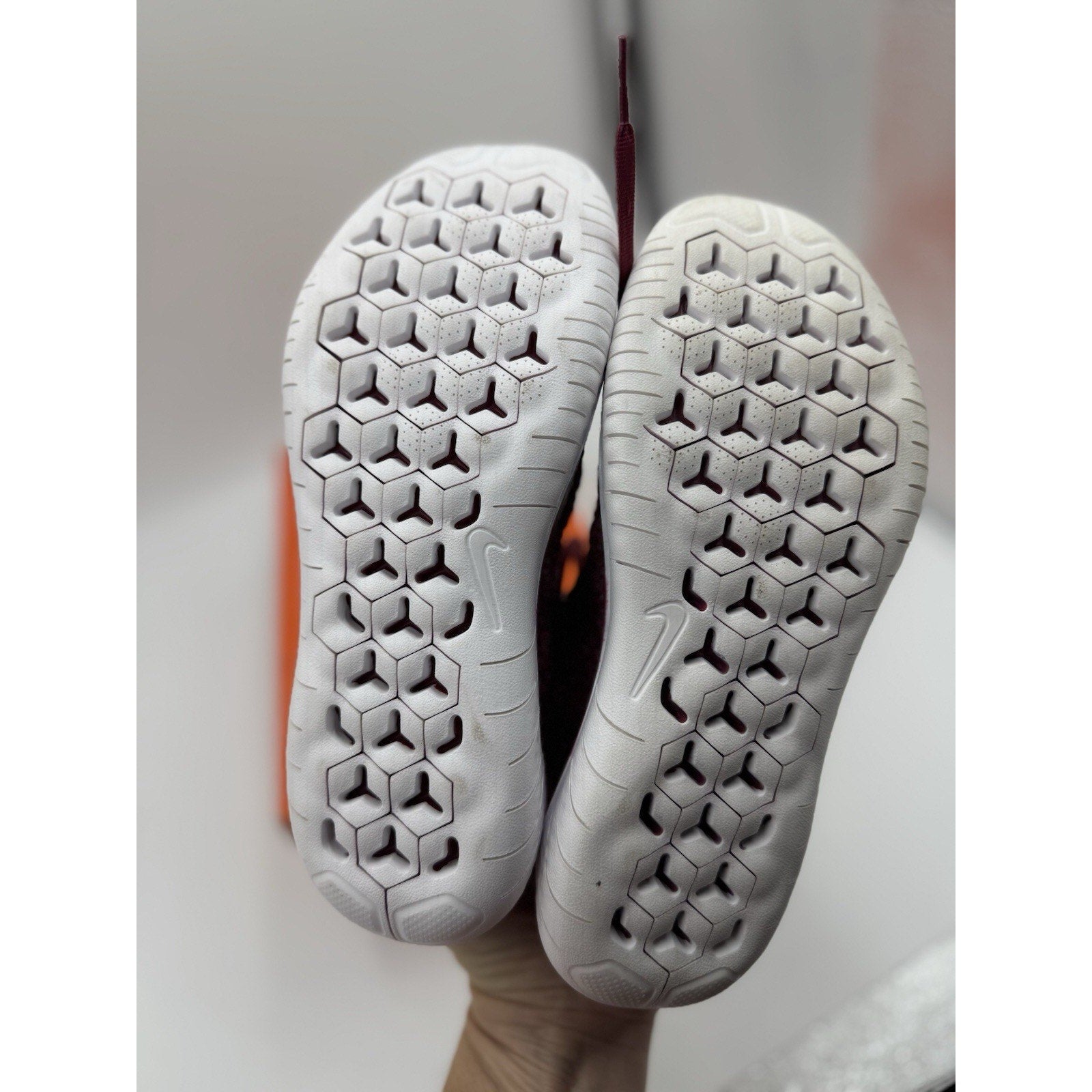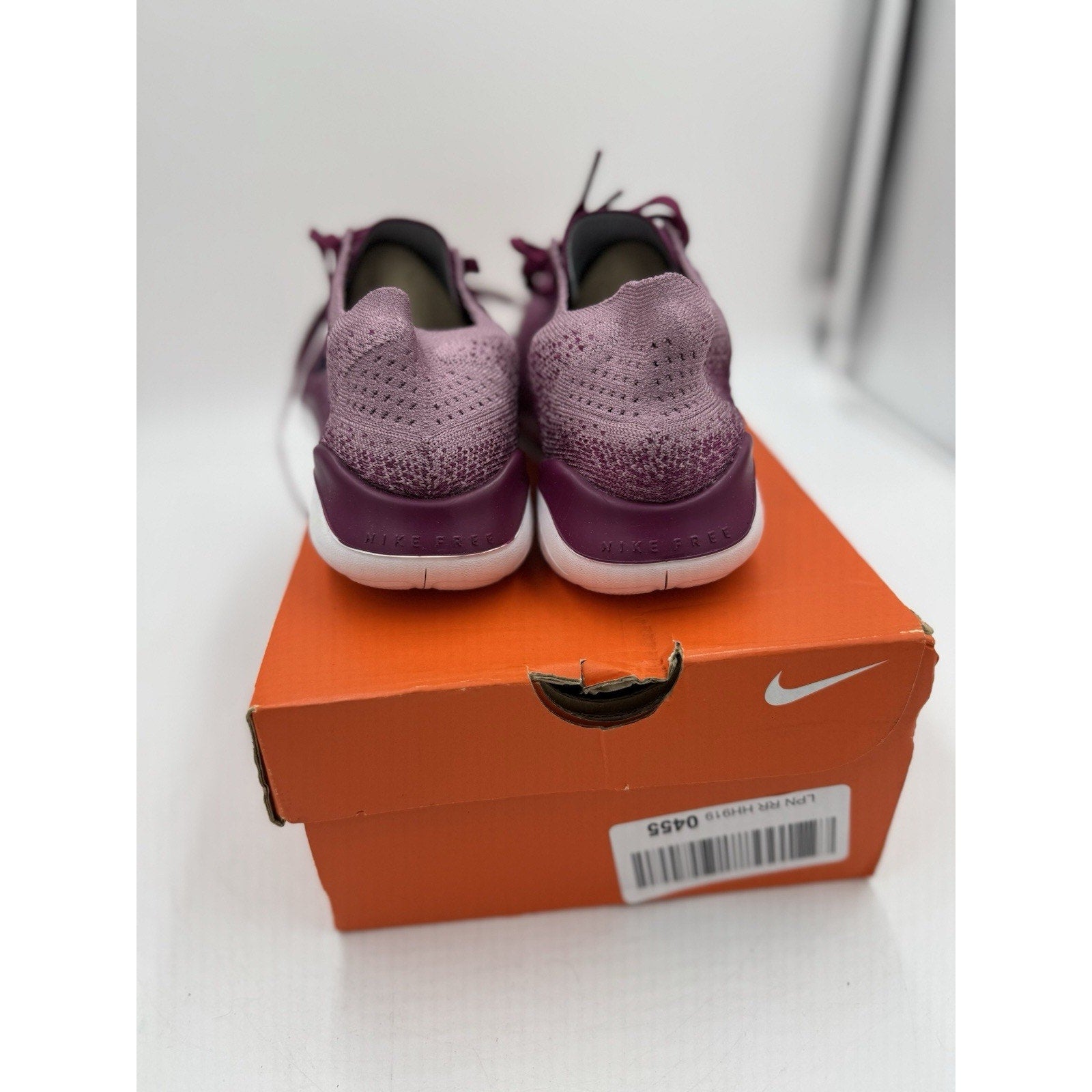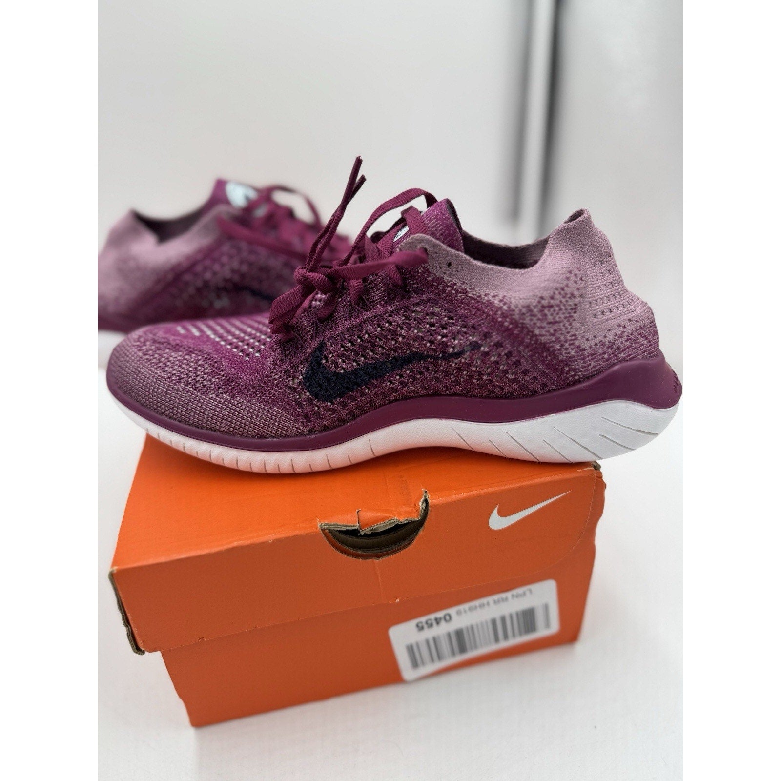 The product is a pair of Nike Free RN Flyknit 2018 sneakers in Raspberry Red, designed for women in a size 6.5. These athletic shoes feature the innovative FlyKnit upper material and belong to the Nike Free product line. The stylish and comfortable design makes them a popular choice for active women looking for both performance and fashion in their footwear.