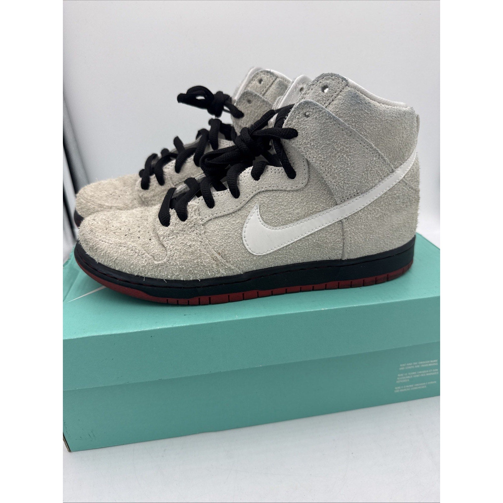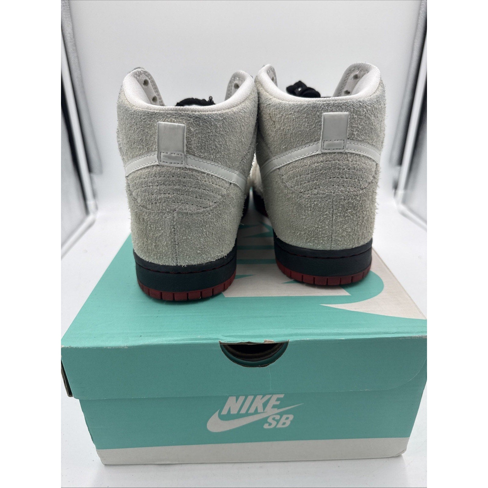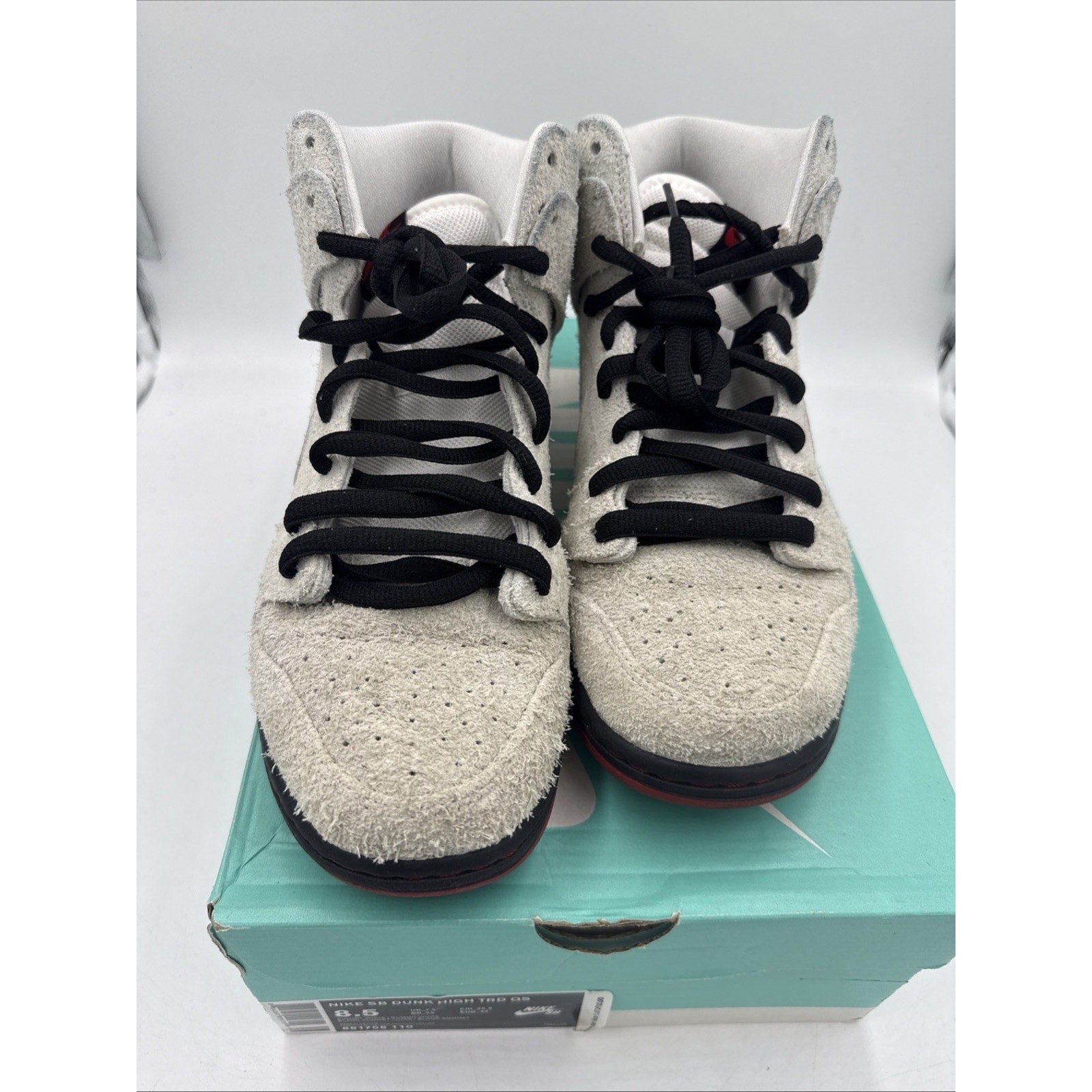 The product is a pair of Nike Black Sheep x SB Dunk High sneakers in size 8.5. These black high-top sneakers were released in 2017 and feature a stylish design that combines elements from both Nike Dunk and SB Dunk collections. With a classic sneaker style and athletic design, these shoes are perfect for men looking to make a fashion statement with their footwear. The white colorway adds a versatile touch that can easily complement various outfits.