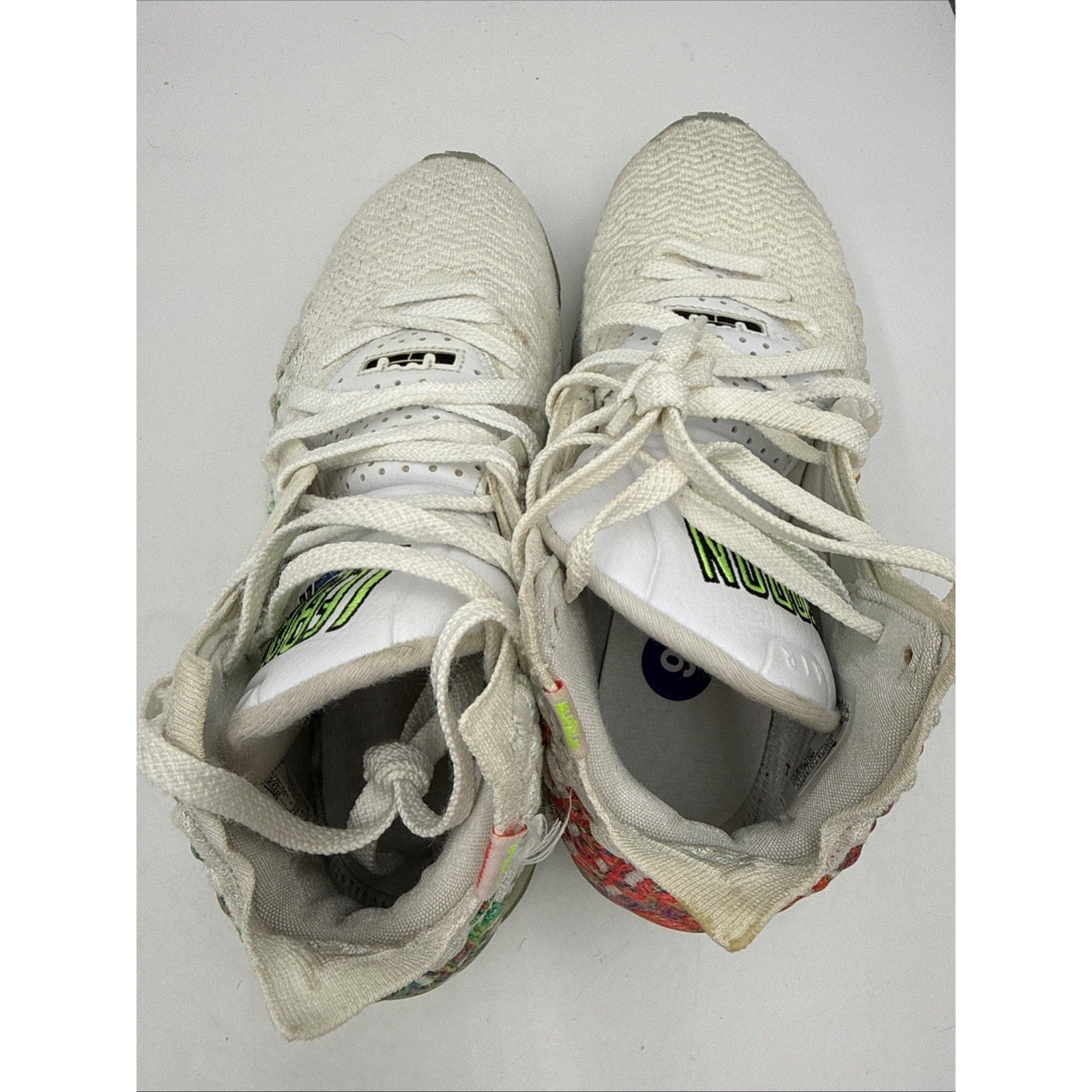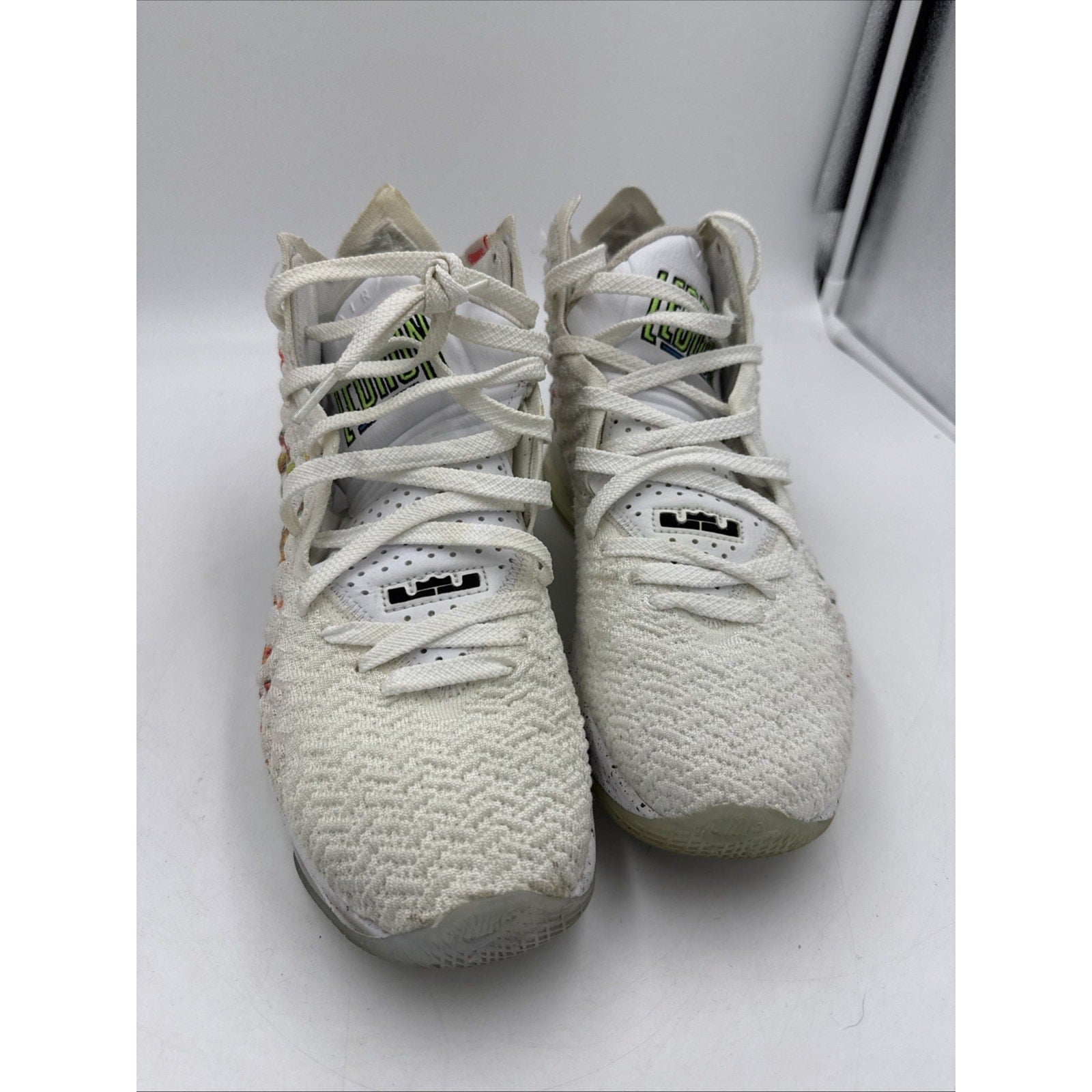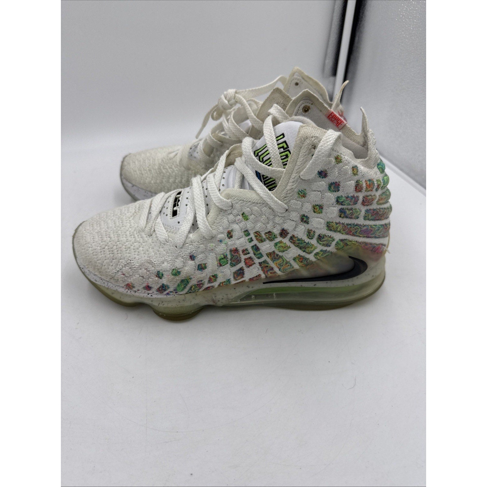 The product is a pair of Nike LeBron 17 Air Command Force sneakers in size 8.5 for men. These athletic shoes were released in 2020 and feature a white colorway with a knitposite upper material. The sneakers belong to the Nike LeBron product line and are designed in a stylish sneaker style. The model number for this specific pair is BQ3177-100.