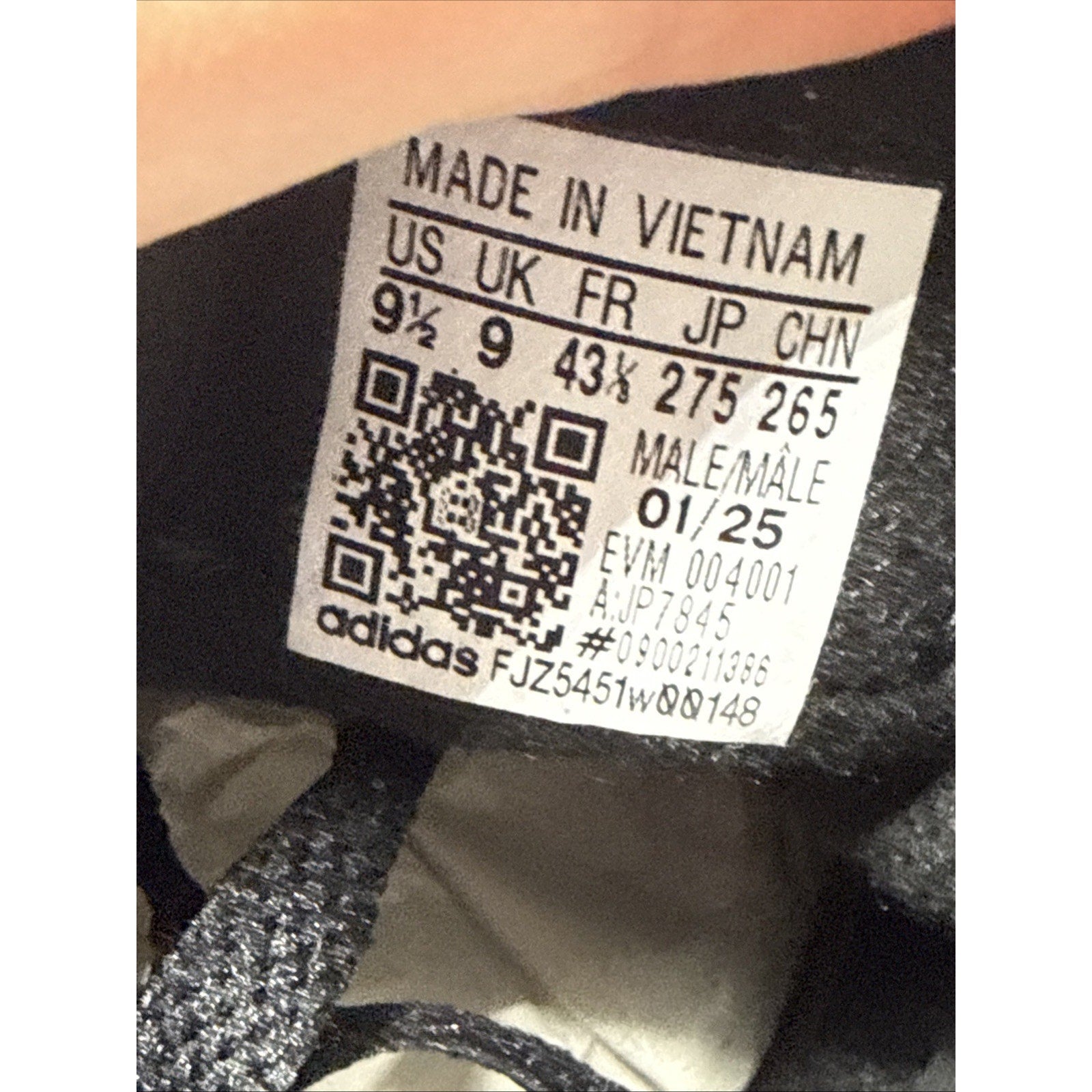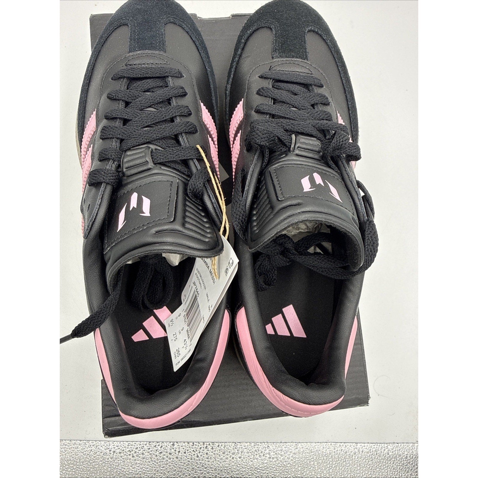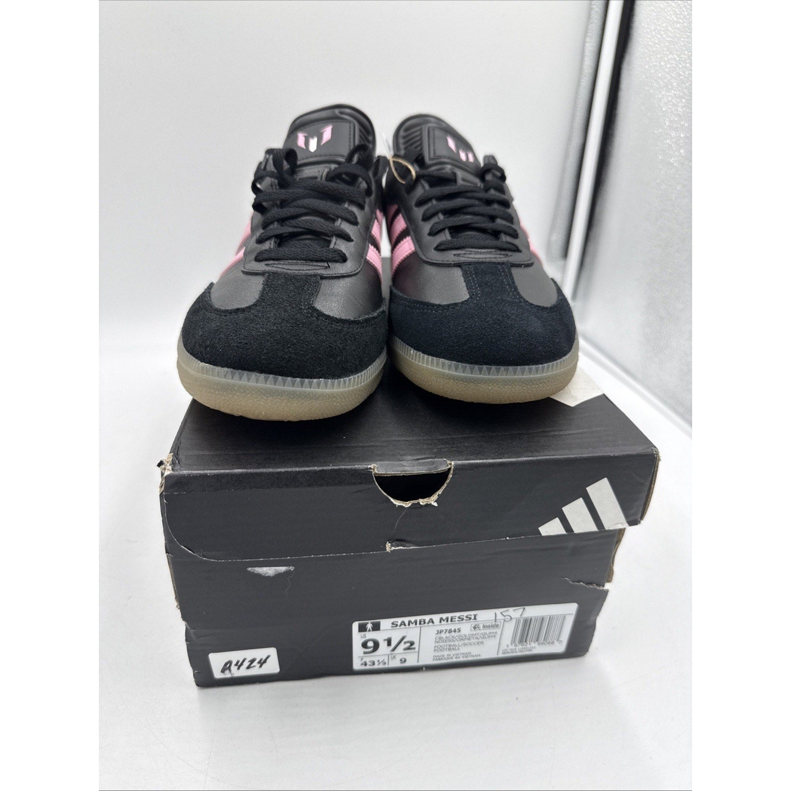 The product is a pair of adidas Samba sneakers in size 9.5, featuring a Lionel Messi x Inter Miami CF away kit design. The sneakers are black in color with a leather upper material, and belong to the adidas Samba product line. With a style code of JP7845 and a release year of 2025, these athletic shoes are designed for men who appreciate both style and performance on the field or court.